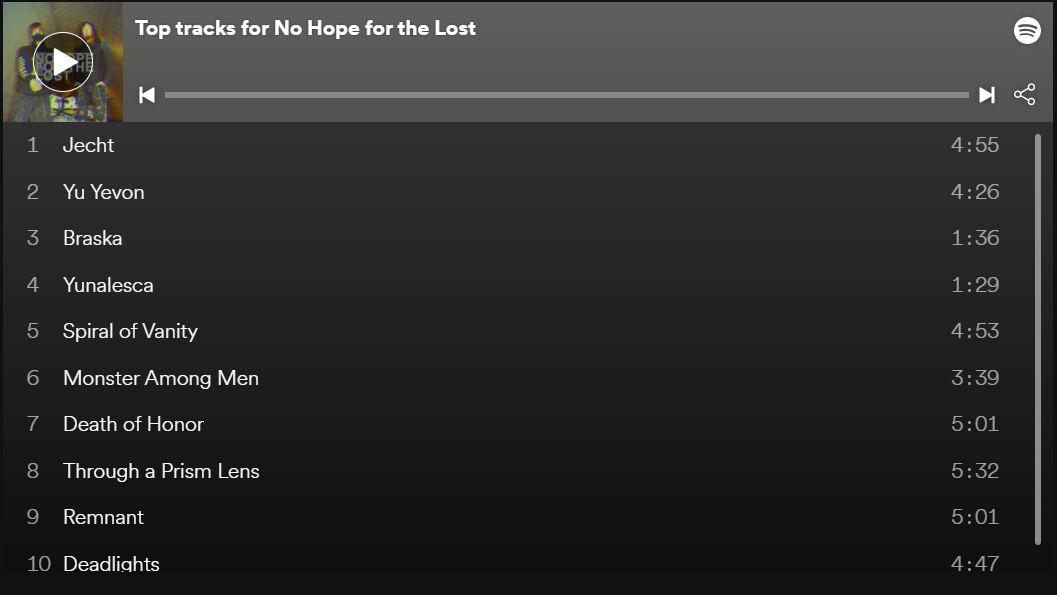 Combining influences of progressive metal, metalcore, and various influences from science fiction to video games, No Hope for the Lost delivers a unique sound that is as heavy as it is accessible. Their 2021 EP "The Pilgrimage" is centered around the classic video game Final Fantasy X, and they have re-released their old Deadlights material as a homage to their formative days, thus continuing the pattern of being influenced by various works of fiction. New EP coming 2022.